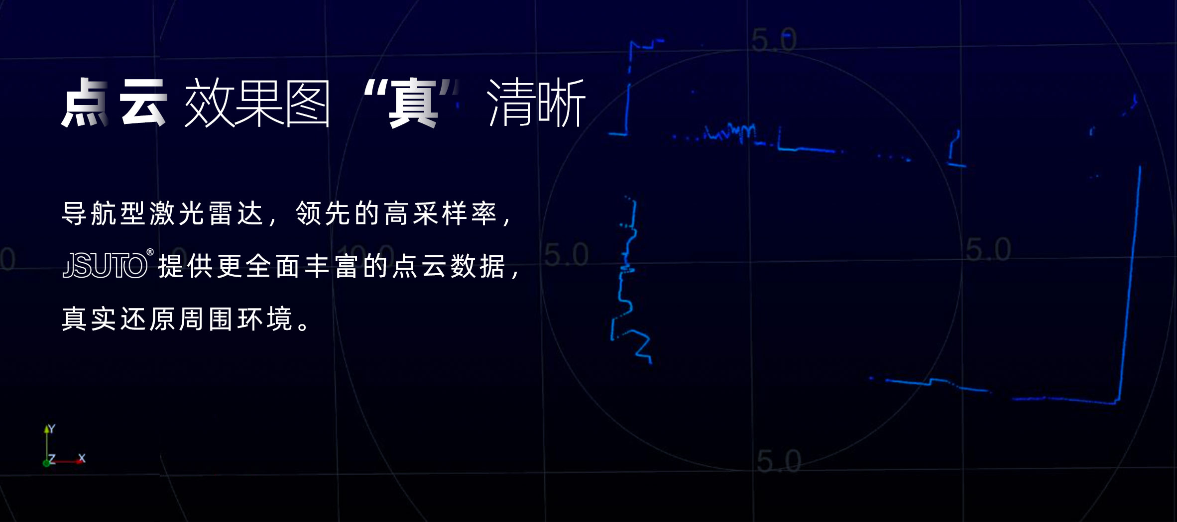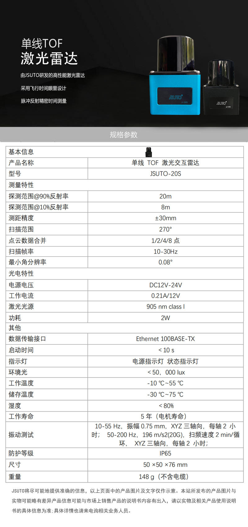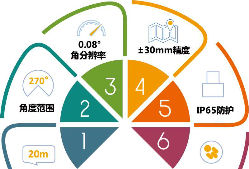JSUTO可实现20m范围内的准确测量, 角度范围270°,得益于TOF方案优势和JSUTO 特有的高性能时间测量技术,JSUTO表现出远高于三角法雷达的测距性能,即便是对20m处的白板测量,也可获得±30mm的测距精度。提供业内顶尖的0.08°ZUI小角分辨率,实现对周围环境的精细还原。用户可以通过配置改变电机转速从而使输出的点云图像帧率在10-30Hz范围内调节。